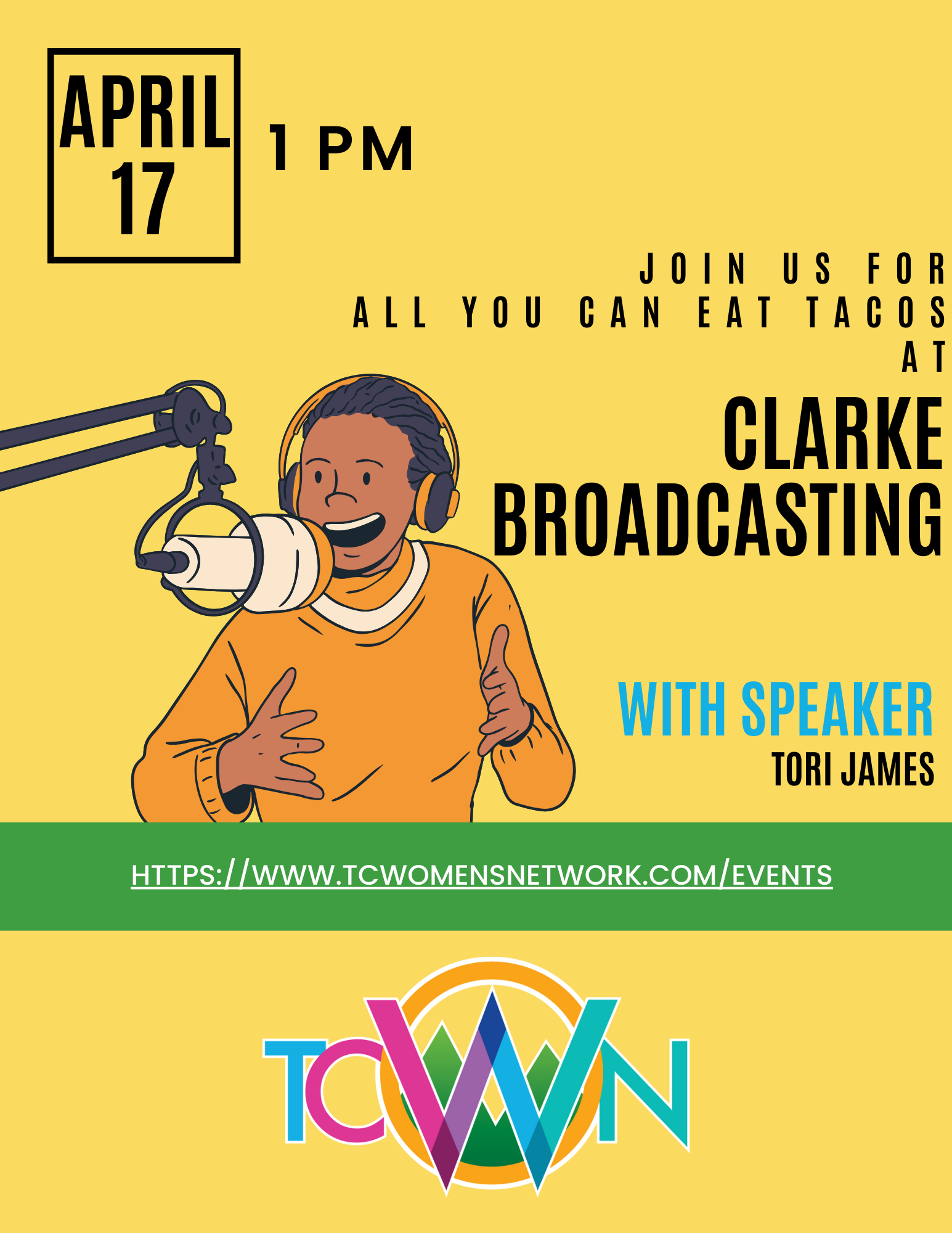 Join us for all-you-can-eat tacos at Clarke Broadcasting with guest speaker Tori James!
